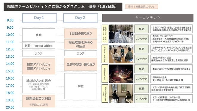 図1:プログラム例 「組織のチームビルディングに繋がるプログラム研修(1泊2日版)」