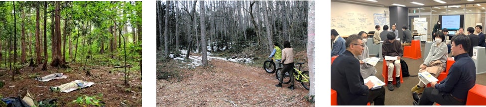写真左から:森のセラピー(森林浴)、サイクリング、地域の方との対話会