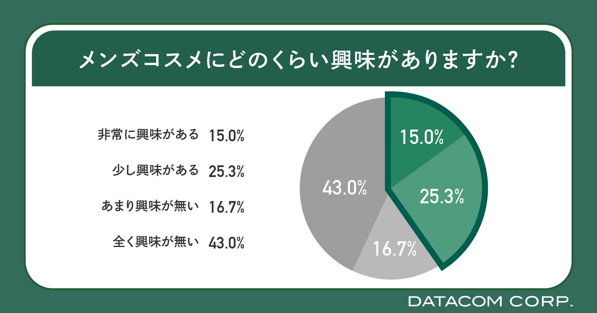 メンズコスメへの興味について聞いたところ、「非常に興味がある」が15.0%、「少し興味がある」が25.3%と全体の40.3%が興味を持っているということが分かりました。