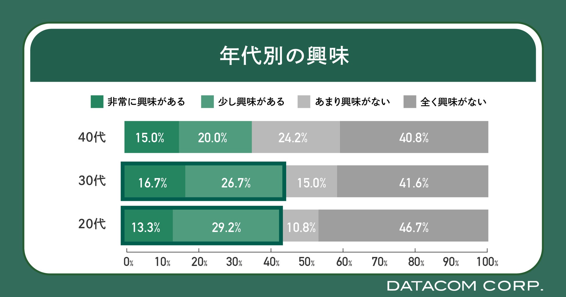 また、年代別に興味関心の度合いをみると、20代、30代は40代と比較すると興味を持っている人の割合が高いという結果になりました。