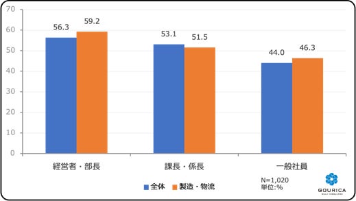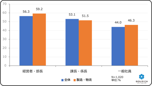 ただし役職別に見ると差が出ます。製造・物流の経営者・部長では「仕組み化」が59.2%と、全体の経営者・部長(56.3%)を上回りました。課長・係長でも51.5%と半数を超え、マネジメント層ほど仕組み化を重視する姿勢が鮮明です。対照的に、一般社員では「個人での対応」が53.7%と「仕組み化」(46.3%)を上回り、現場に近いほど個人の工夫で対処しようとする意識が強く出ています。