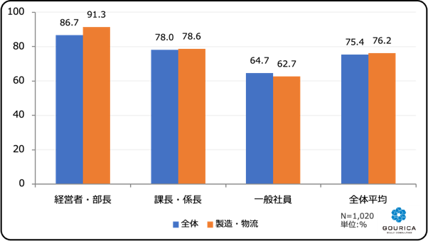 製造・物流の経営者・部長に限ると75.7%に達し、全体の経営者・部長を3.9ポイント上回っています。仕組み化や外部活用を志向しながらも、属人化は依然として残っており、理想と現実のギャップが存在しています。