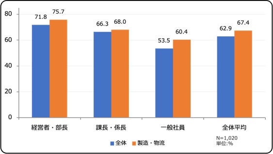 専門的定型業務が特定の人に集中していると「感じる」割合は、全体で62.9%。製造・物流業界では67.4%と4.5ポイント高く出ています。経営者・部長は71.8%、課長・係長は66.3%と高水準である一方、一般社員は53.5%にとどまりました。