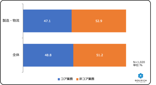 製造・物流業界に限定すると、コア業務は47.1%と全体を1.7ポイント下回り、非コア業務は52.9%とやや高い水準でした。差は1〜2ポイント程度と大きくはないものの、製造・物流ではコア業務に充てられる割合がやや少なく、非コア業務の比重が高い傾向が見て取れます。いずれの業界でも非コア業務が過半を占めており、コア業務に集中できる時間は半分程度にとどまっています。