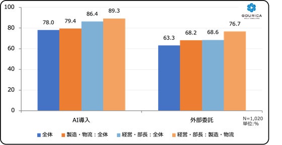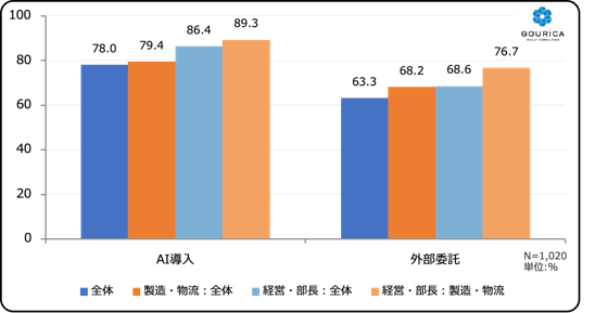 とりわけ製造・物流の経営者・部長は「システム・AI導入」89.3%、「外部委託」76.7%と突出しており、全体の経営者・部長(86.4%、68.6%)との差も明確です。