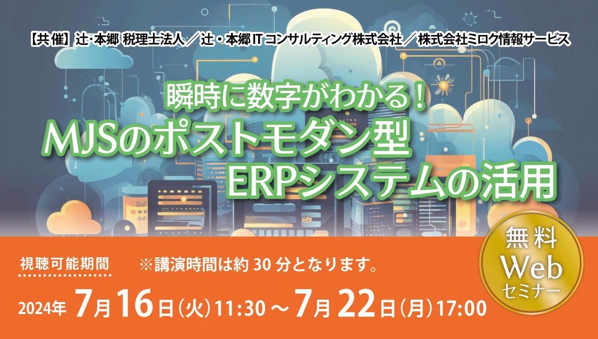 辻・本郷 税理士法人(本社:東京都新宿区、理事長:徳田孝司)は、辻・本郷 ITコンサルティング株式会社(本社:東京都渋谷区、代表取締役社長:黒仁田健)と株式会社ミロク情報サービス(本社:東京都新宿区、代表取締役社長:是枝周樹)の3社共催で「瞬時に数字がわかる! MJSのポストモダン型ERPシステムの活用」セミナーを開催いたします。本セミナーでは、「ERPって何?」というところから、メリットとデメリット、事例を交えた活用方法を、財務会計・人事給与システムのトップベンダーの1社である株式会社ミロク情報サービスのEPRシステムを使って解説します。
