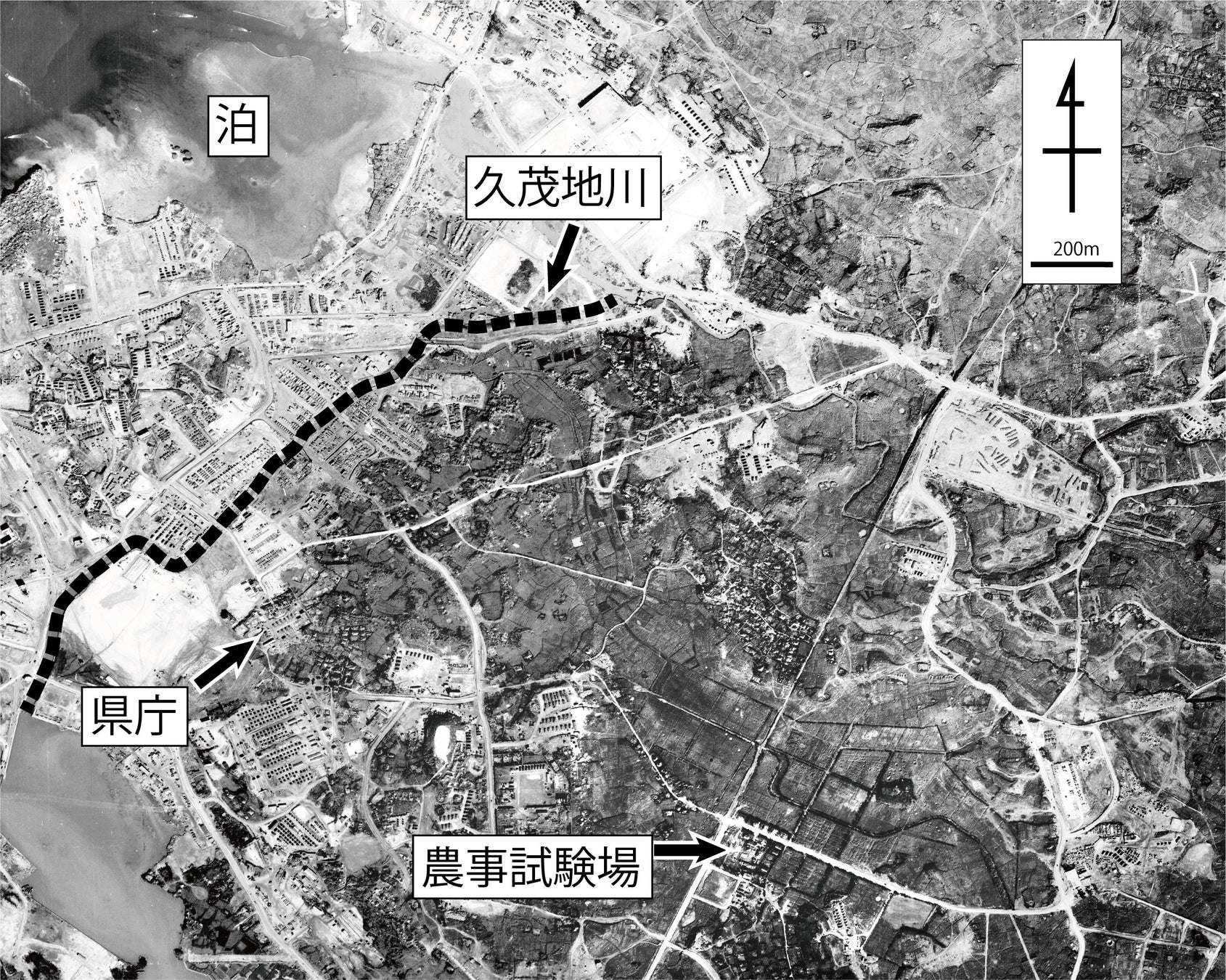 図3:1945年12月10日に米軍が撮影した沖縄県農事試験場付近の垂直空中写真 (沖縄県公文書館所蔵: 写真番号AP451210A0_024と026を接合)。当時、県農事試験場から久茂地川(黒破線)の南岸までは耕作地が広がっていた。