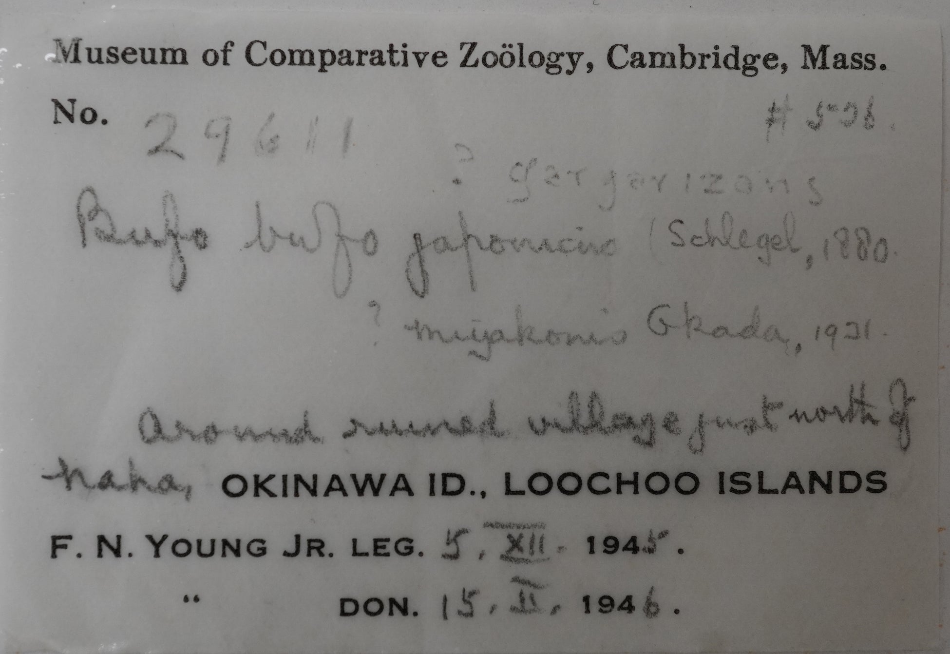・ハーバード大学比較動物学博物館の所蔵標本から、1945年12月に那覇北部で米軍関係者が採集したミヤコヒキガエルのオスの標本を確認しました。