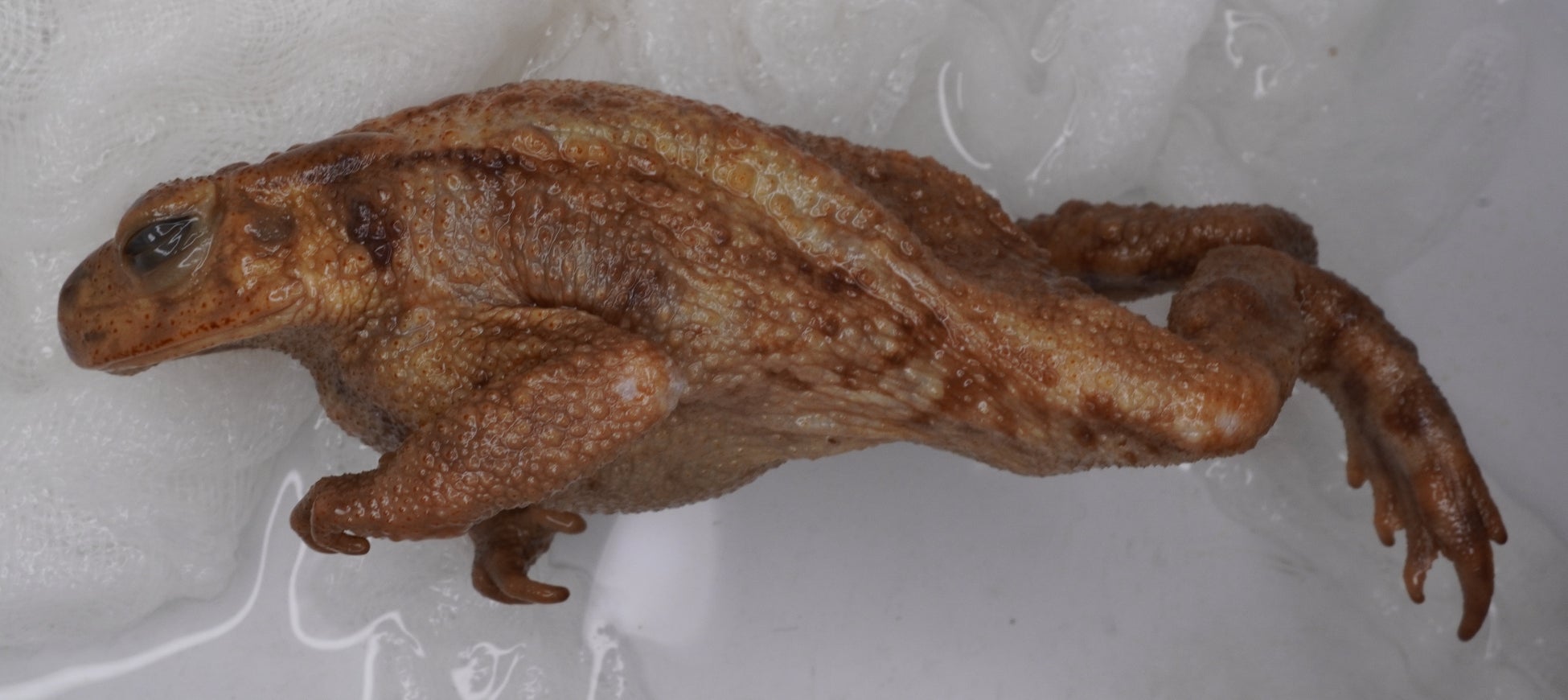 図1:米国ハーバード大学比較動物学博物館に保管されていた那覇産ミヤコヒキガエルの標本。体長(吻端から総排出口までの長さ)は約6.5 cm。