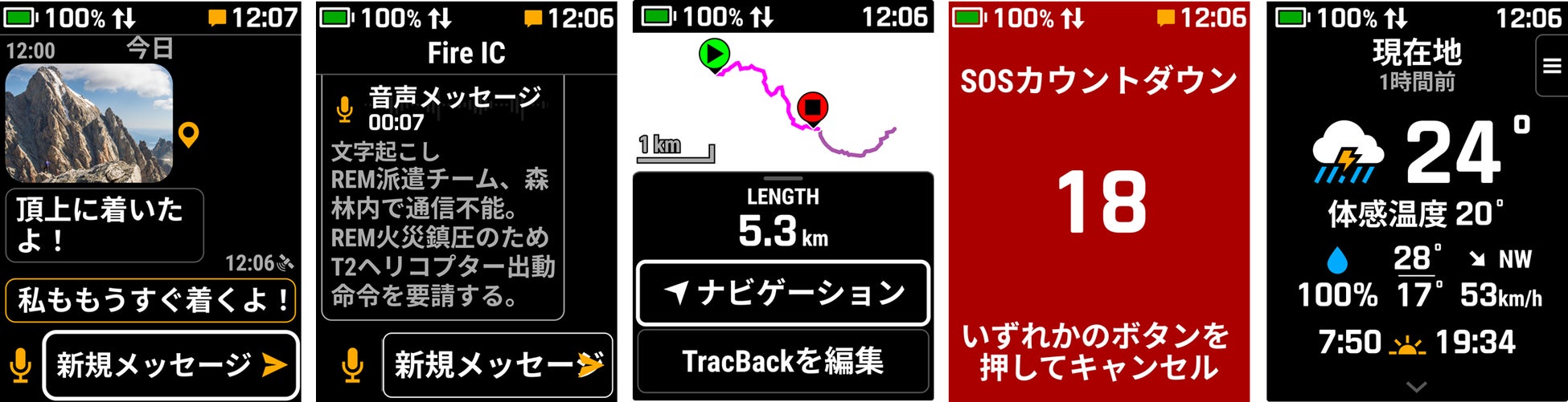 衛星通信を介した双方向通信、トラッキングと現在地のLiveTrack(衛星使用)、インタラクティブSOS発信、写真と音声メッセージの送信、グループトラッキング/メッセージ |