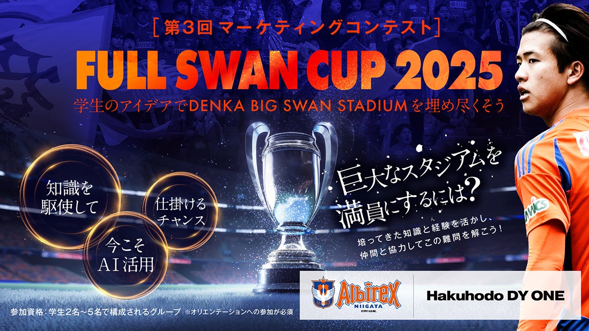 株式会社Hakuhodo DY ONE(本社:東京都港区、代表取締役会長:田中雄三 代表取締役社長:小坂洋人、以下 Hakuhodo DY ONE)は、Jリーグ加盟プロサッカークラブのアルビレックス新潟(株式会社アルビレックス新潟:新潟県新潟市、代表取締役社長:中野幸夫、以下 アルビレックス新潟)と共同で、今回で3回目となる、学生を対象としたマーケティングコンテスト「FULL SWAN CUP 2025」を開催します。アルビレックス新潟のホームスタジアムであるデンカビッグスワンスタジアムを満員にするマーケティングプランを募り、最終選考では新潟大学経済科学部准教授および、クラブの事業責任者が審査員としてより実践的な評価を行います。