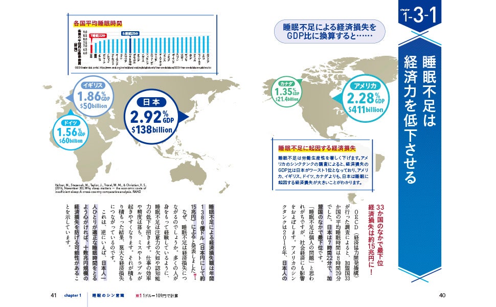 そもそも睡眠は、体の休養だけでなく、脳の再構築や免疫の調整などに必要なもので、睡眠不足は健康にも仕事のパフォーマンス、ひいては国の経済力にも悪影響を及ぼします。日本人一人ひとりが適正な睡眠時間をとるよう心がければ、数十兆円規模の経済損失を防げる可能性があります。