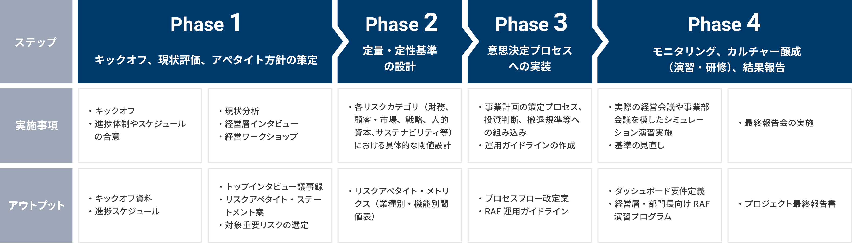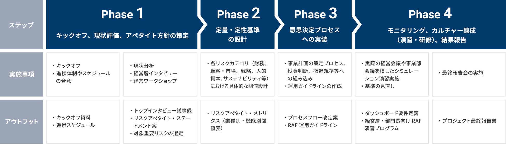 しかし、RAFを有効に機能させるためには、経営層が定義したリスクアペタイトを、現場が使える具体的な判断基準へと落とし込む高度な実装力が必要となります。そこで当社は、RAFの構築を通じて組織全体での適切なリスクテイクを促し、“攻め”の経営の実現を支援する本サービスのリリースに至りました。
