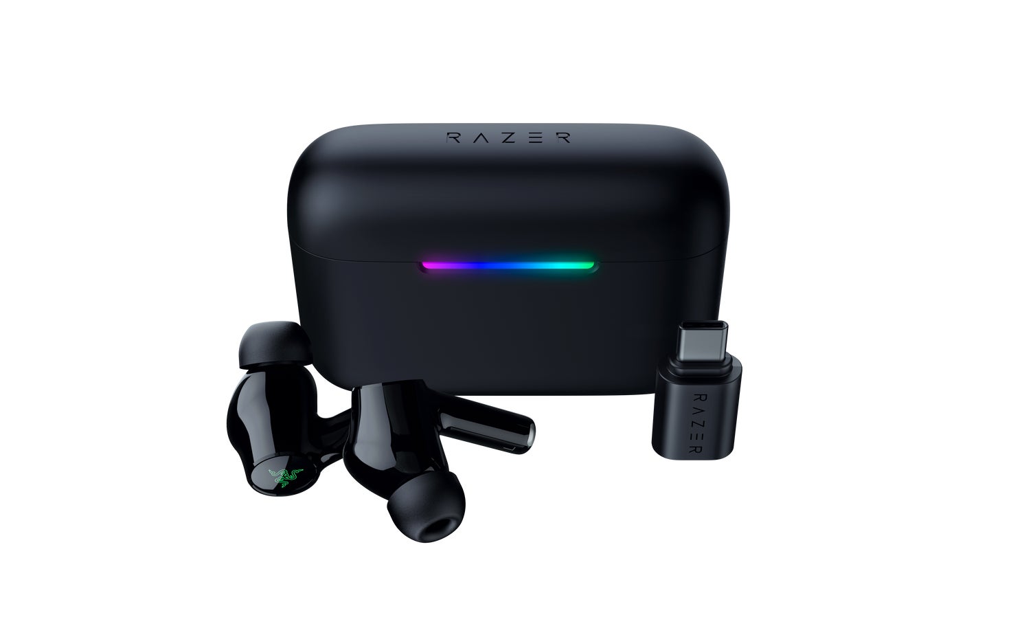 体験の中心となるのは「HyperSpeed Case」です。このケースは充電ケースとしての機能に加え、コンパクトなHyperSpeedドングルを内部に収納することで、2.4GHzワイヤレスレシーバーとしても機能します。ドングルを装着した状態であれば、対応デバイスではRazer HyperSpeed Wirelessによる接続が可能となり、さらにUSB-Cでケースを直接接続すれば、再生しながら充電することもできます。