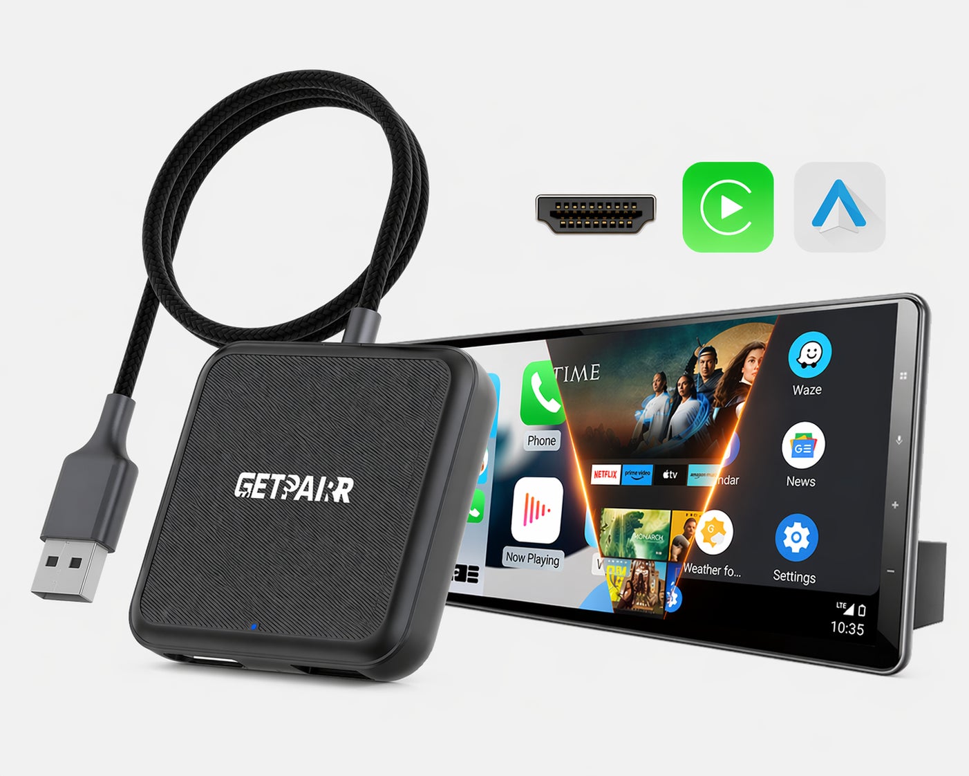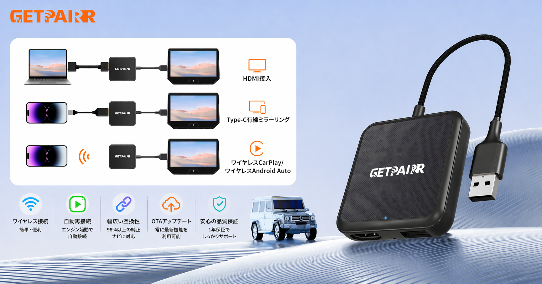 GETPAIRRは、車内での接続や使い分けをもっとシンプルにしたいユーザーに向けて、ワイヤレスCarPlay/ワイヤレスAndroid Auto、HDMI入力、Type-C有線ミラーリングに対応した多機能アダプター 「GetPairr TV」 をAmazon.co.jpにて販売しています。