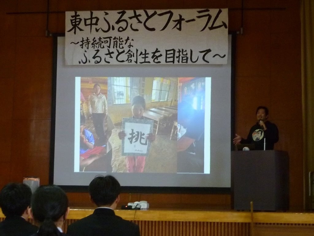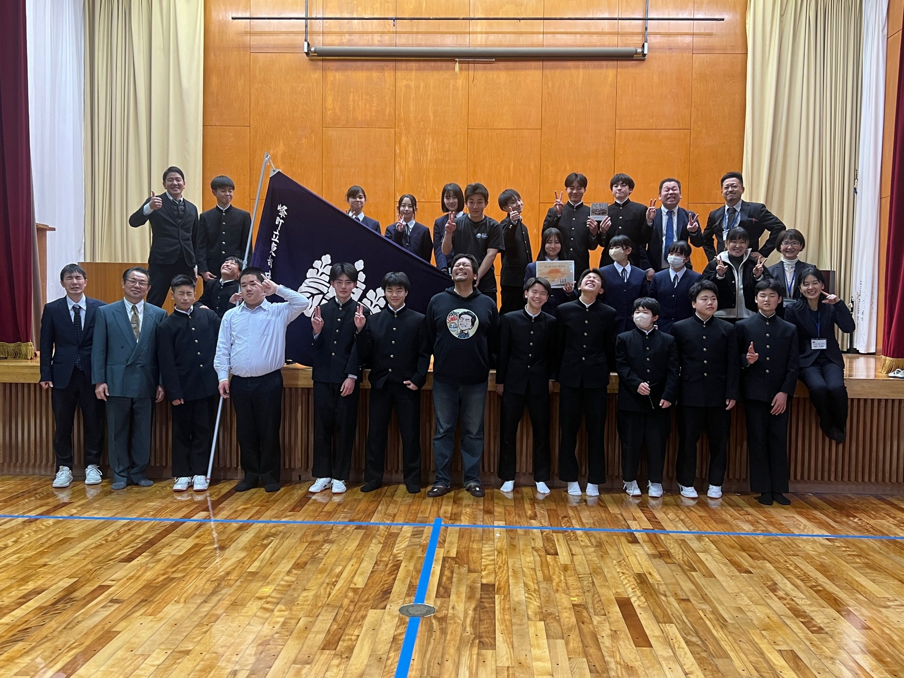 東部中学校では、年度の学習成果を発表する学習発表会の中で、なかよし学園が生徒たちの世界での活躍を紹介する講演を実施しました。講演後には地域の方々も集う「東中ふるさとフォーラム」が開催され、生徒たちの学びを学校内にとどめず、地域社会と共有する機会となりました。
