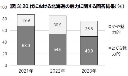 今回の調査では北海道が15年連続で魅力度1位となったが、その点数は2021年の73.4点から徐々に低下している。その原因の一つは、20代からの評価が低下していることがあげられる。20代が北海道を「とても魅力的」と答えた人の割合は2023年は49.9%で、2022年の54.6%、2021年の68.0%より大きく低下している(図3)。その結果、20代による今回の魅力度は63.3点で、前年の70.0点、2021年の77.9点より大幅に低下してしまった。