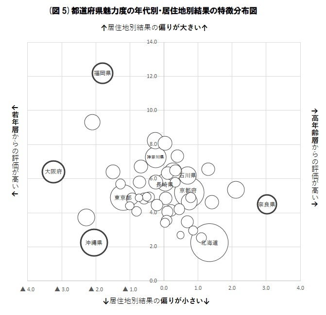 例えば福岡県は九州地域からの評価が極めて高く、大阪府は若年層からの評価が高い。沖縄県は若年層からも高く、地域に偏りなく全国から満遍なく評価を受けている。そして奈良県は高齢者層からの評価が高いことになる。