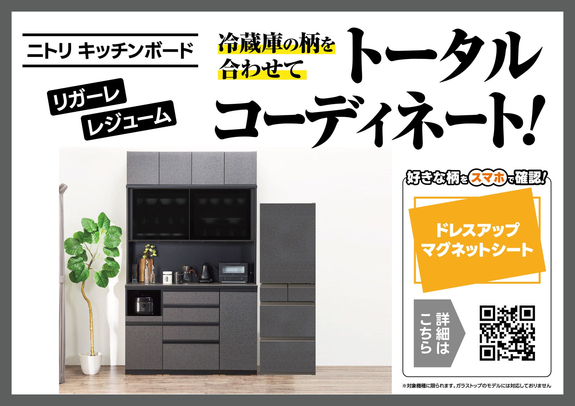 また、ニトリのキッチンボード(リガーレ・レジューム)に合わせたデザインを追加いたしました。エディオンで取り扱っております、リガーレシリーズおよびレジュームシリーズとのトータルコーディネートをお楽しみいただけるようになりました。