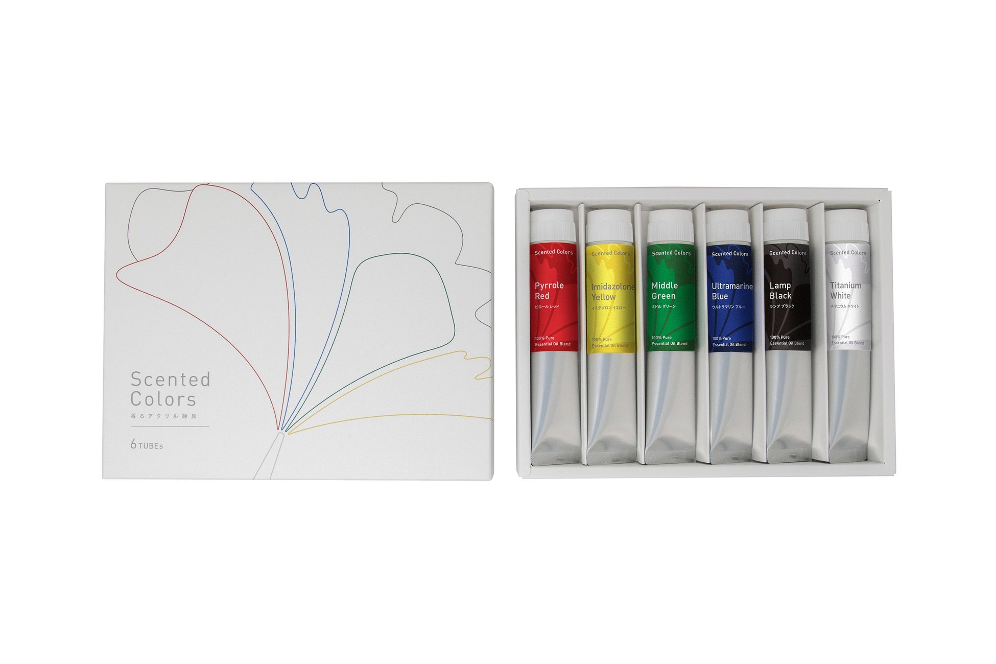 「香るアクリル絵具」は100%天然アロマで香りづけしたアクリル絵具です。絵具の色は、ピロール レッド、イミダゾロン イエロー、ミドル グリーン、ウルトラマリン ブルー、ランプ ブラック、チタニウム ホワイトの6色あり、それぞれの色をイメージしてブレンドされた香りを感じることができます。