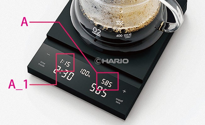 レシピ作成に必要な抽出比率(*)の計算がスケール上で完結可能。注ぐべきお湯の量が表示されます。