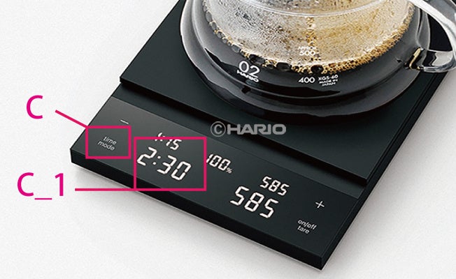 C_1 :time modeを押すと、お湯を注ぐと当時に