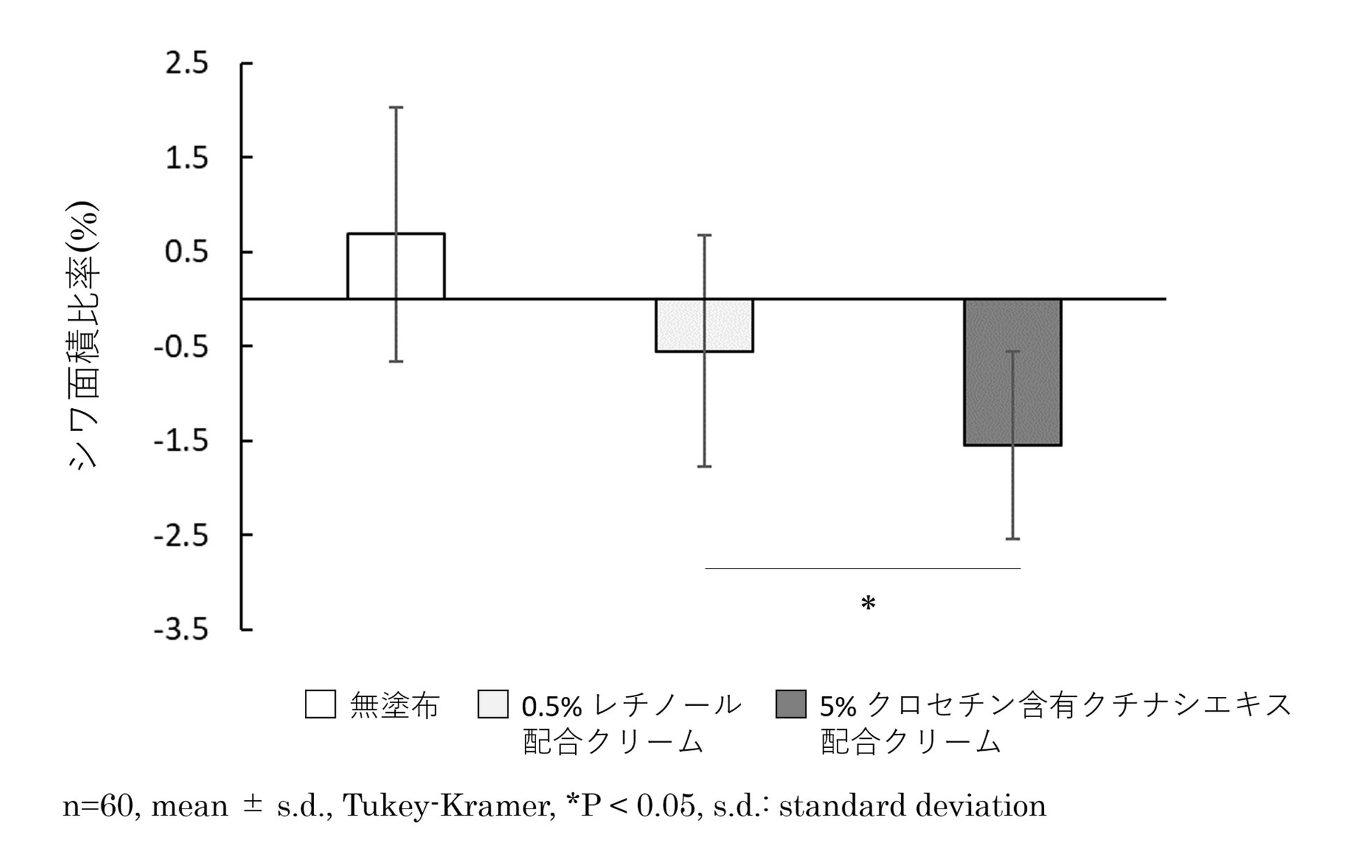 4週間の連用試験において、5%クチナシ由来クロセチン含有エキス配合クリームは0.5%レチノール配合クリームよりも高い抗シワ効果がありました(それぞれの推奨濃度で比較)。