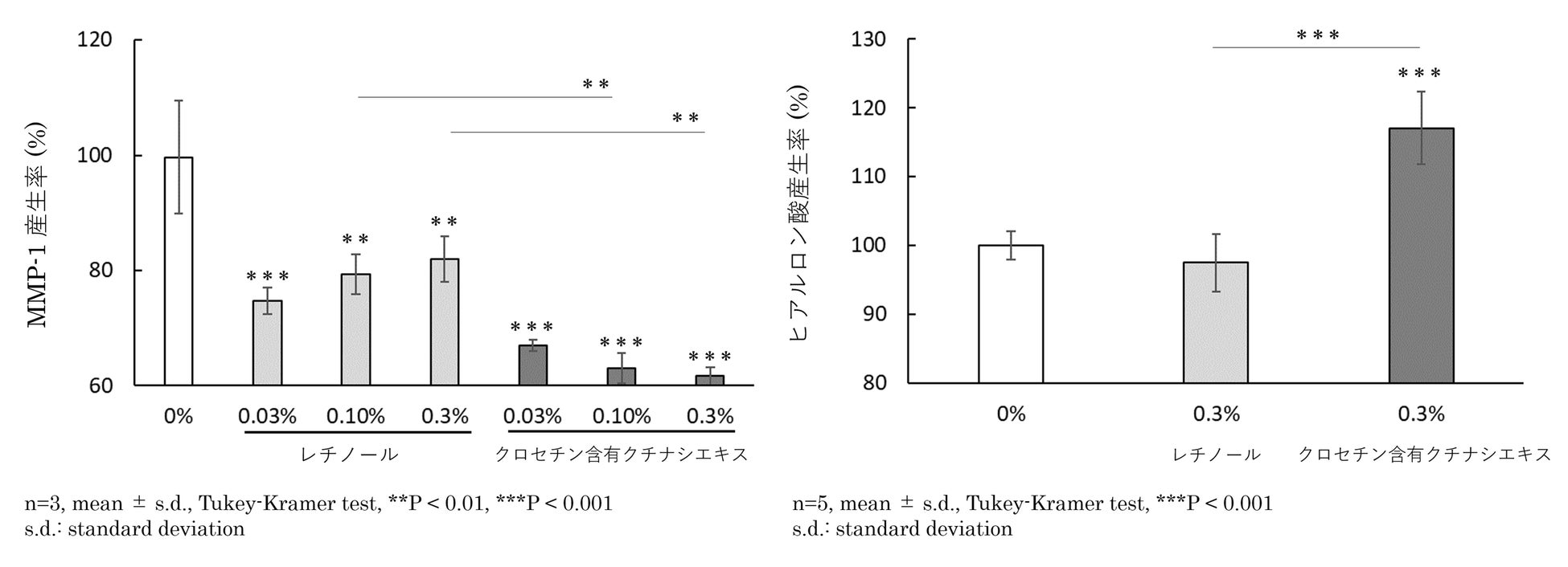 クチナシ由来クロセチン含有エキスは、レチノールよりも優れたコラーゲン分解(MMP-1)抑制作用とヒアルロン酸促進作用を示しました。