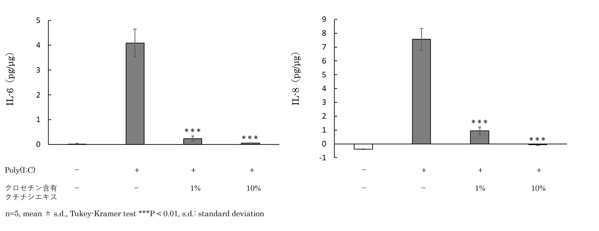 ケラチノサイトから炎症惹起物質(Poly(I:C))によって分泌される炎症因子、インターロイキン-6(IL-6)とインターロイキン-8(IL-8)の放出をクチナシ由来クロセチン含有エキスは抑制しました。