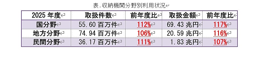 分野別では、「国分野」で取扱金額が70兆円に迫るなど、高額な税金・料金を安全かつ確実に決済できるキャッシュレス納付手段としての地位を確立しています。また、「地方分野」においても、eL-QR※2の普及定着を背景として、eLTAX(共通納税システム)※3を経由した利用が高い伸びを示しており、地方税納付手段として深く浸透しています。国分野・地方分野においては、電子申請を行った後に簡単に口座引落しによる納付が可能なダイレクト納付の利用が伸長しています。さらに、「民間分野」についても、多様なキャッシュレス決済が普及する中で、チャージ不要で金融機関決済の安心感を求めるユーザーから改めて選択されております。その結果、全分野において安全・安心な決済インフラとして着実に成長しています。