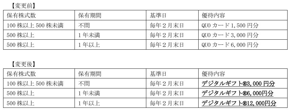 優待実施発表後に株主様よりQUOカードだけではなく、利用者ごとに使用しやすいものを選択できる品目での優待希望を多く頂いたこともあり、このたび、当社株主優待実施における株主の皆様の利便性向上を目的に、QUOカードpayや、Amazonギフトカードなど希望に応じて選択できる株式会社デジタルプラス(コード番号:3691)が提供するデジタルギフト®に優待品目を変更することといたしました。