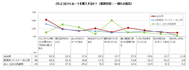 「どのようなチョコレートを購入するか」については、「自分で食べるものに関してはブランドや品質を気にする」ものの、「友人・会社の同僚にあげるものではブランド・品質などよりも個包装であることや見た目のかわいらしさ、パッケージを気にしている」という特徴がみられました。自分用の方が中身に対するこだわりが強いというのは、興味深い結果ではないでしょうか。自分用というバレンタインの新しい楽しみ方が広がっているのかもしれません。