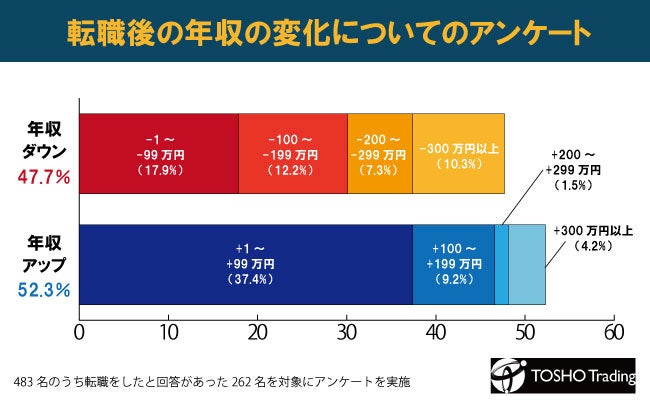 東晶貿易株式会社(東京都港区六本木、代表:大泉弘晶)のTOSHO転職ONLINE編集部(https://af.tosho-trading.co.jp/media/)は、22歳〜55歳の転職経験がある男女262人を対象に、転職前の年収と転職後の年収、そして転職前後の年収変化についてのアンケート調査をおこないました。