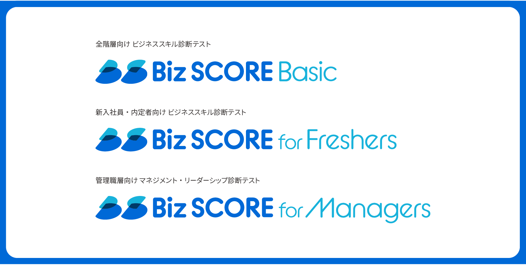 組織の中で期待される成果を継続的に出すために必要な知識・スキルを診断するテスト。全階層向けビジネススキル診断テスト「Biz SCORE Basic」、新入社員・内定者向けビジネススキル診断テスト「Biz SCORE for Freshers」、管理職向けマネジメント・リーダーシップ診断テスト「Biz SCORE for Managers」と階層別にサービスを展開しています。