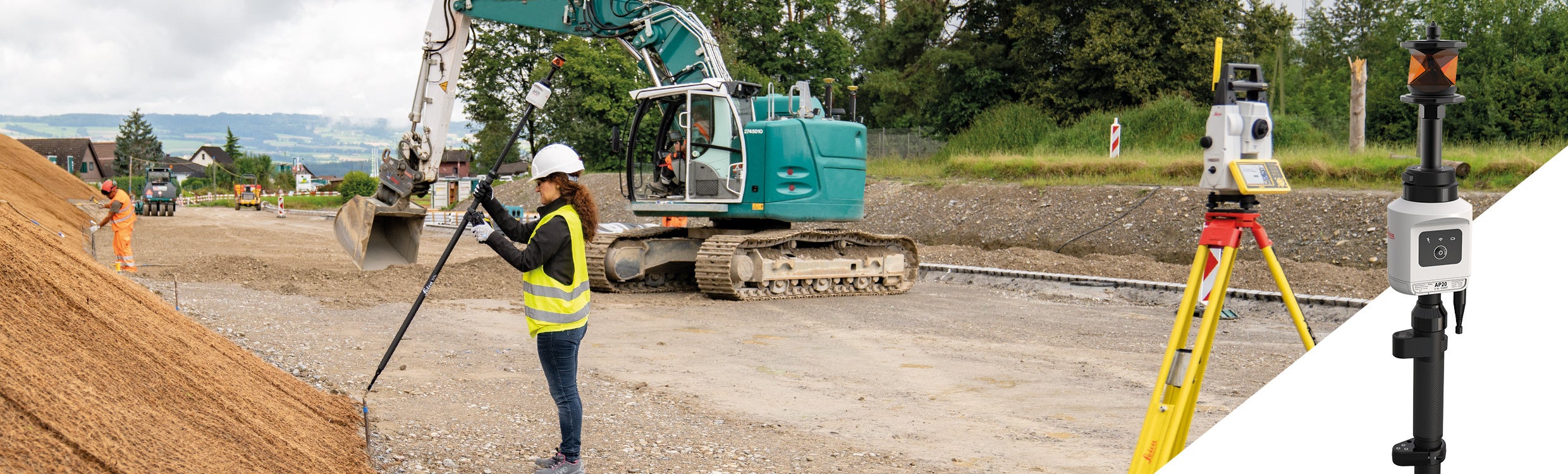 AP20は従来通りプリズムポールを鉛直にして利用する事も可能ですが、起伏の激しい現場でプリズムポールを鉛直に立てる事が困難な場合なども斜めに傾けて計測が可能な為、作業スピードを飛躍的に向上させます。この特徴を生かし、更に専用フィールドアプリ内の「表面検査・ロードランナー・DTM杭打ち」等の情報化施工向けのアプリと組み合わせて使用する事でより効果的な活用が見込めます。
