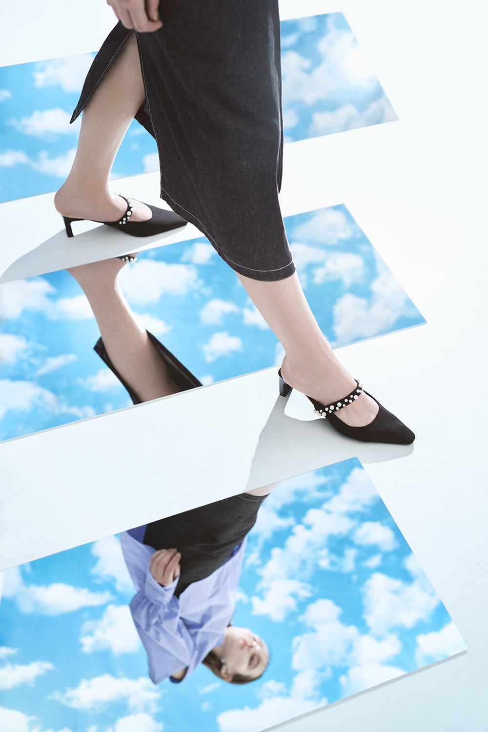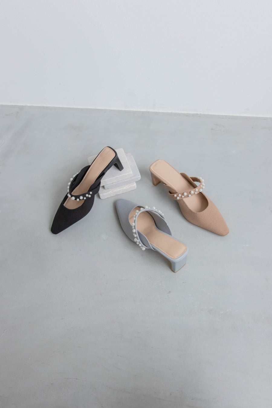 足元をぐっと女性らしく見せてくれる、パールをあしらったミュールパンプス。