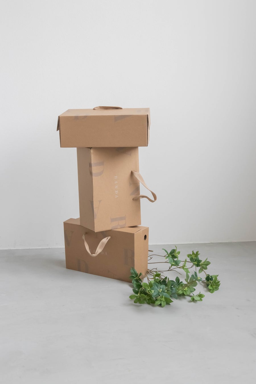 ボックス本体に持ち手を付けショッパーと一体型にしたことで、ショッパーが不要になります。