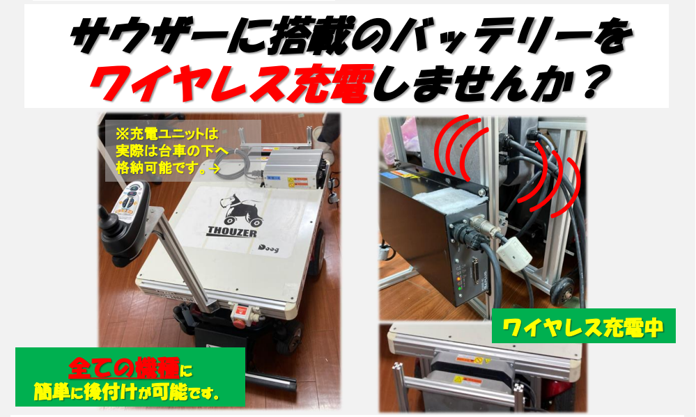 ものづくりの工場や倉庫などの自動化・省人化の動きが加速する中、(株)Doog社のサウザーの協働運搬ロボットをご使用のお客様よりバッテリーを交換せずに自動でワイヤレス充電したいというご要望をいただきましたのがきっかけでした。(株)Doog社と協力し、搭載確認及び動作検証を行い、この度ワイヤレス充電器を取り付けたいご希望のお客様へもスムーズにご案内ができるようになりました。これからは「自立走行運搬ロボット+ワイヤレス充電」の組み合わせは好評をいただいております。どのタイプのサウザーにも後付け搭載が可能です。ご興味がございましたら弊社営業部sales@b-plus-kk.jpまでお問い合わせください。