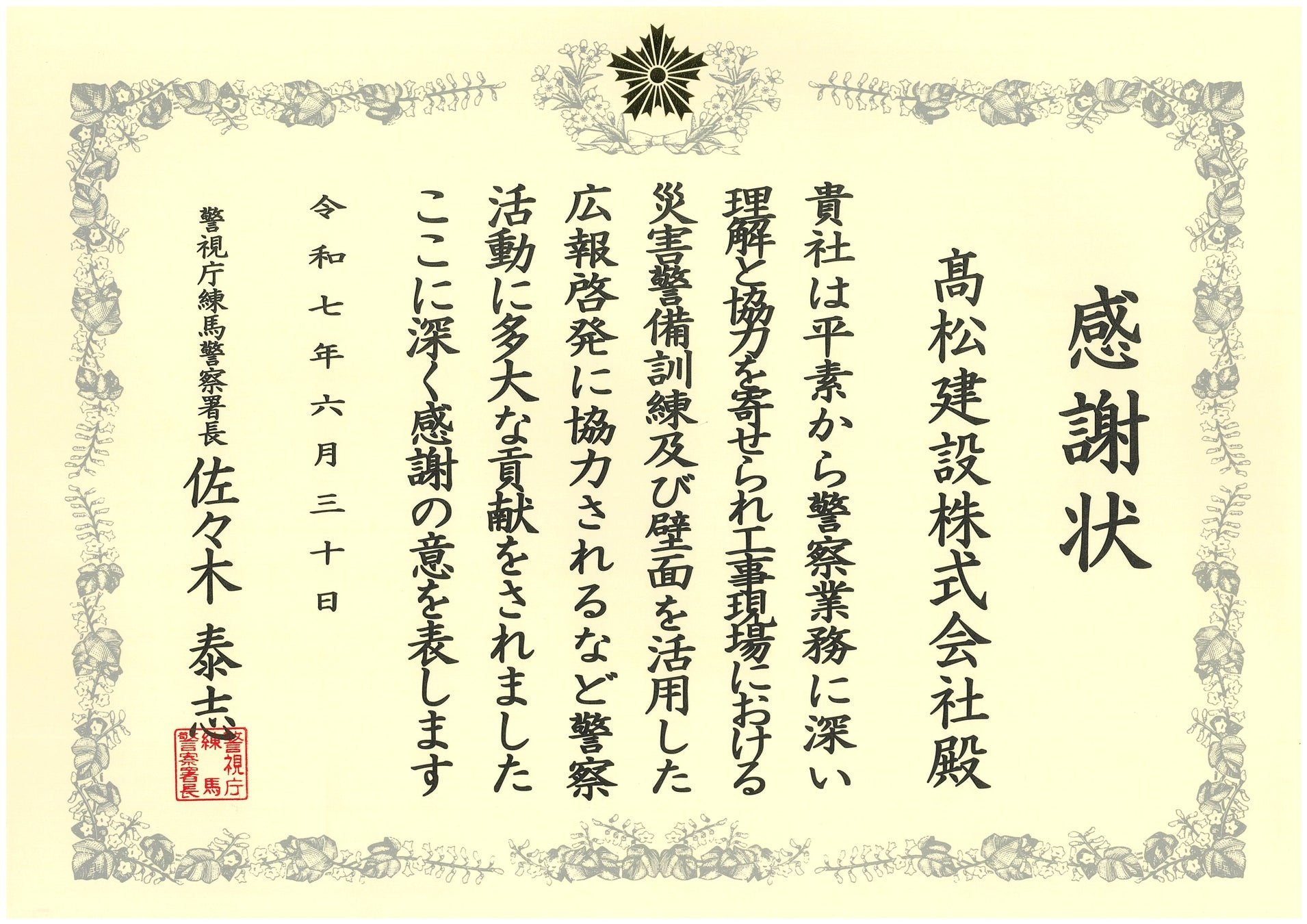 髙松建設株式会社(本社:大阪府大阪市、代表取締役社長:髙松孝年、以下当社)は、建設現場を活用した安全への取り組みが評価され、2025年6月30日、警視庁練馬警察署より感謝状を受領しました。