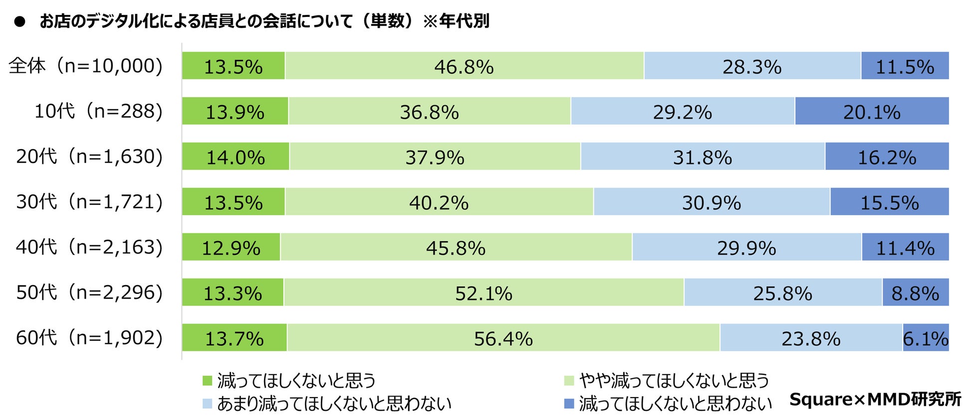 お店のデジタル化による店員との会話について聞いたところ、「減ってほしくないと思う」が13.5%、「やや減ってほしくないと思う」が46.8%と合わせて60.2%が減ってほしくないと思うと回答しました。これを年代別で見ると、減ってほしくないと思う回答は、60代(n=1,902)が70.1%、50代(n=2,296)が65.4%、40代(n=2,163)が58.7%となりました。一方で、減ってほしいと思う回答が多かったのは、10代(n=288)が49.3%と最も多く、次いで20代(n=1,630)が48.0%、30代(n=1,721)が46.4%となりました。
