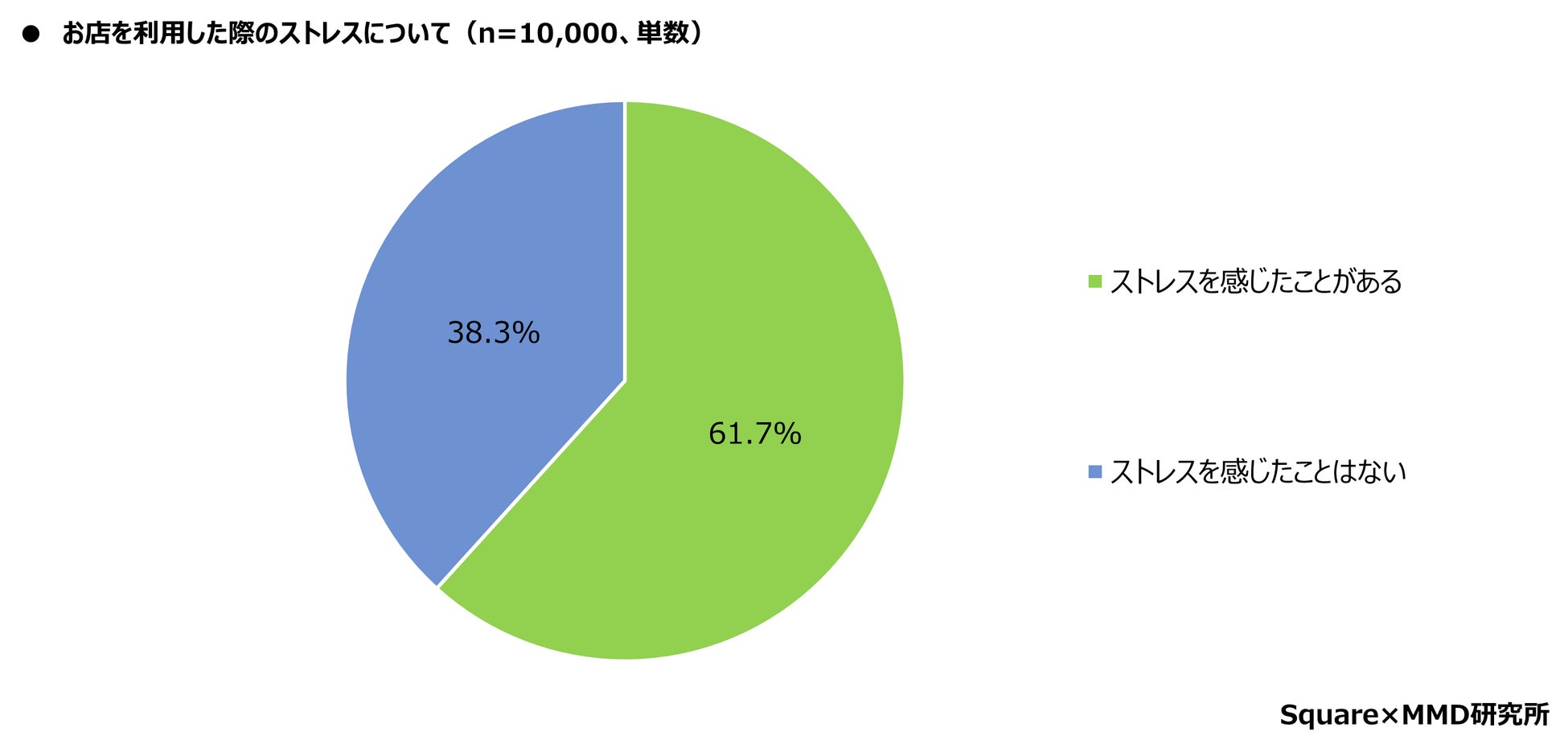 続いて、お店を利用した際にストレスを感じたことがあるか聞いたところ、「ストレスを感じたことがある」は61.7%となりました。