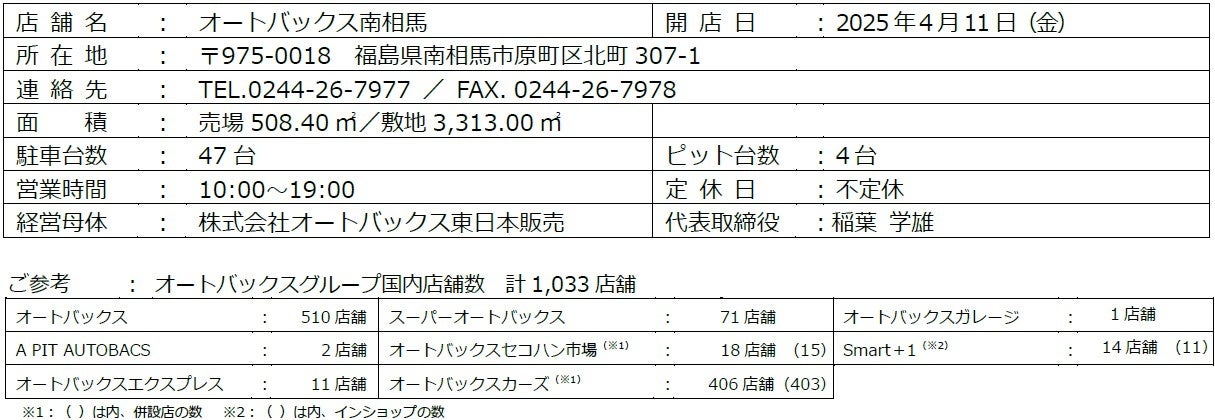 株式会社オートバックスセブン(代表取締役 社長:堀井勇吾)と加盟店契約を結んでいる株式会社オートバックス東日本販売(代表取締役:稲葉学雄)は、2025年4月11日(金)に「オートバックス南相馬」を新規オープンいたします。