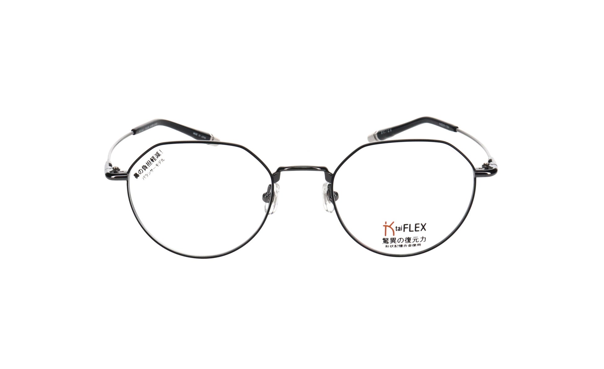 男女ともに使える品番「KF-013」は、多角形のクラウンパント型。クラウンパントとは、上部が直線的で下部に丸みを持たせたデザインで、クラシカルながら顔なじみがよく、近年トレンドとして注目されています。丸みと直線的なラインを併せ持つ個性派フレームながら、ケータイフレックスならではの“究極のシンプル”と掛け合わせることで、個性と洗練を両立させた一本に仕上げました。カラーは、クラシックな印象のブラック、ブラックマット・シルバー、ブラック・ゴールの3色をラインアップしています。
