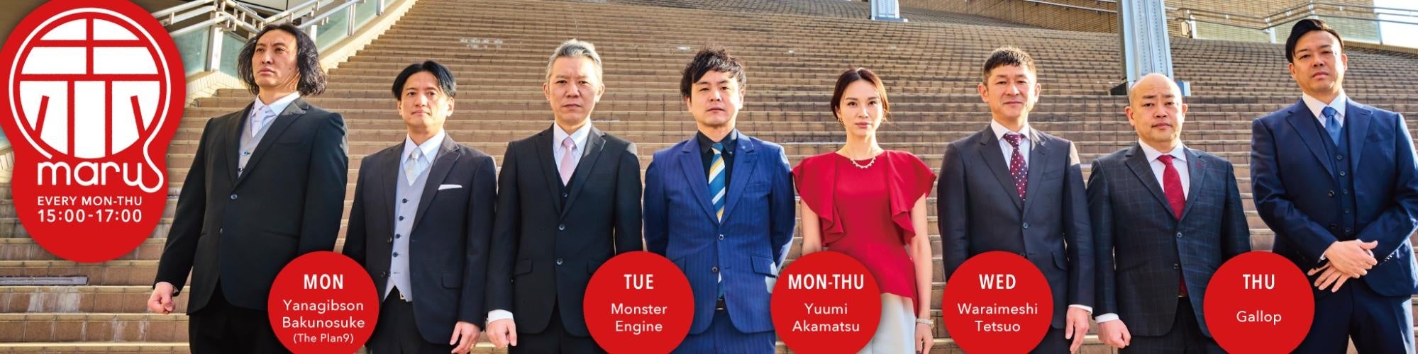 また、赤松悠実が日替わり芸人とお届けしている『赤maru』(月〜木曜日)には、月曜日の新メンバーとしてザ・プラン9のヤナギブソン、爆ノ介が登場。放送時間も15:00-17:00に変更します。