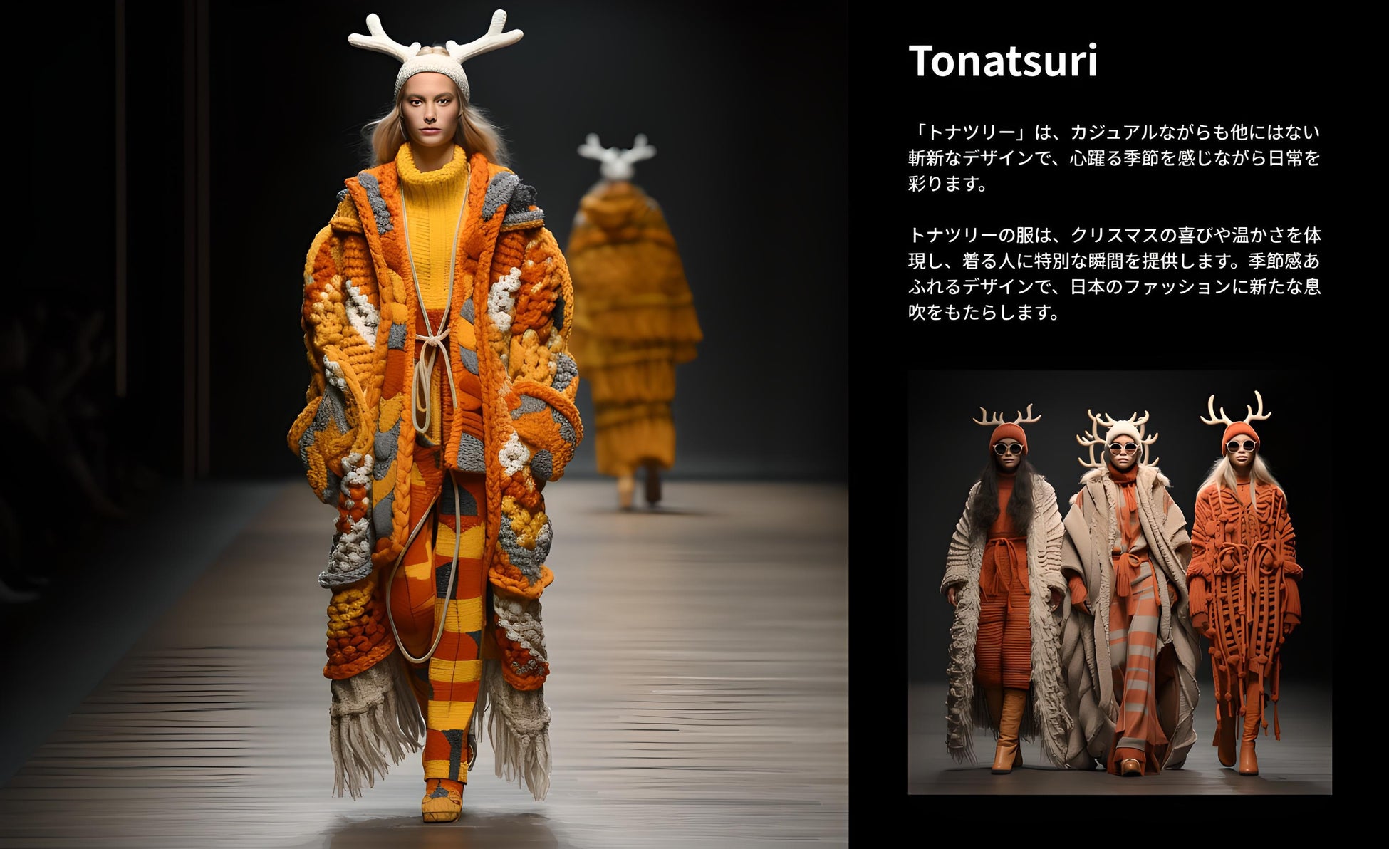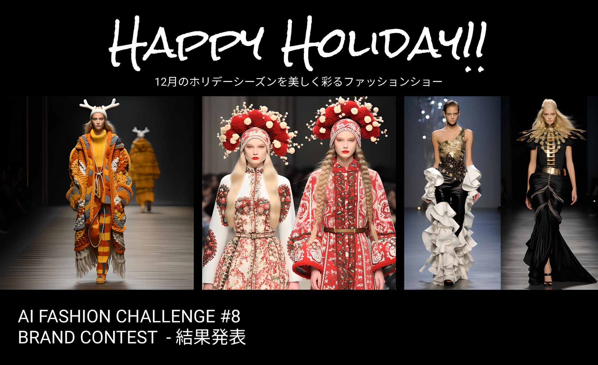 11月22日より約1ヵ月にわたり開催していた今回のコンテストテーマは、この季節にぴったりな「12月のホリデーシーズンを美しく彩るファッションショー」でした。テーマに合わせて自身でコンセプトからデザインまで自由に考えた「ブランド」を、ジェネレーティブAIを活用して生成したアイテムと合わせて参加者には応募いただきました。