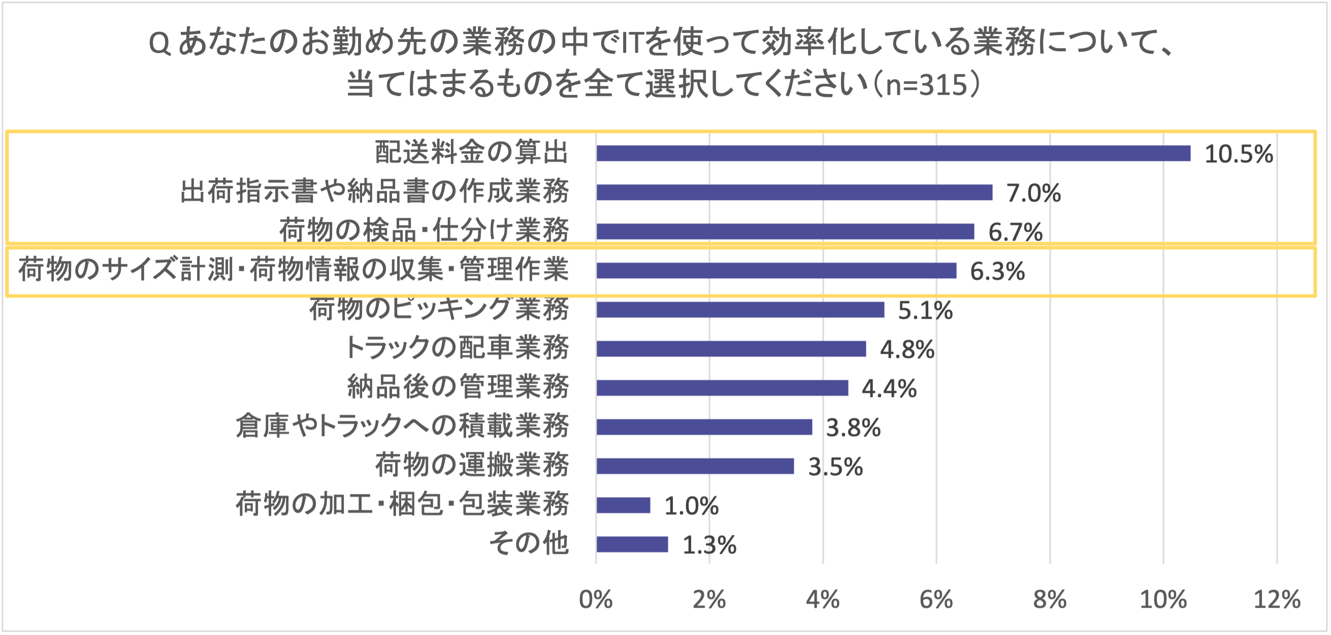 ・効率化が進んでいる業務トップ3は「配送料金の算出(10.5%)」「出荷指示書や納品書の作成業務(7.0%)」「荷物の検品・仕分け業務(6.7%)」