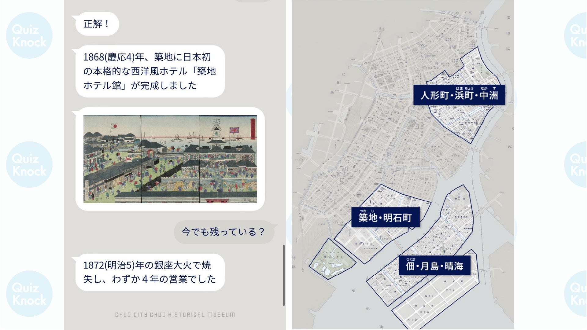 株式会社baton(東京都品川区、代表取締役 衣川洋佑)が運営するQuizKnockが、中央区立郷土資料館(東京都中央区「本の森ちゅうおう」1階)の街歩き体験コンテンツ「まちブラ中央区」のクイズを制作しました。「まちブラ中央区」は、スマホやタブレットを使って資料館の床に広がる1950(昭和25)年の地図をめぐり、クイズを解きながら、中央区内の歴史を楽しく学ぶことができるWebコンテンツで、館内に設置されたQRコードから誰でも無料でお楽しみいただけます。
