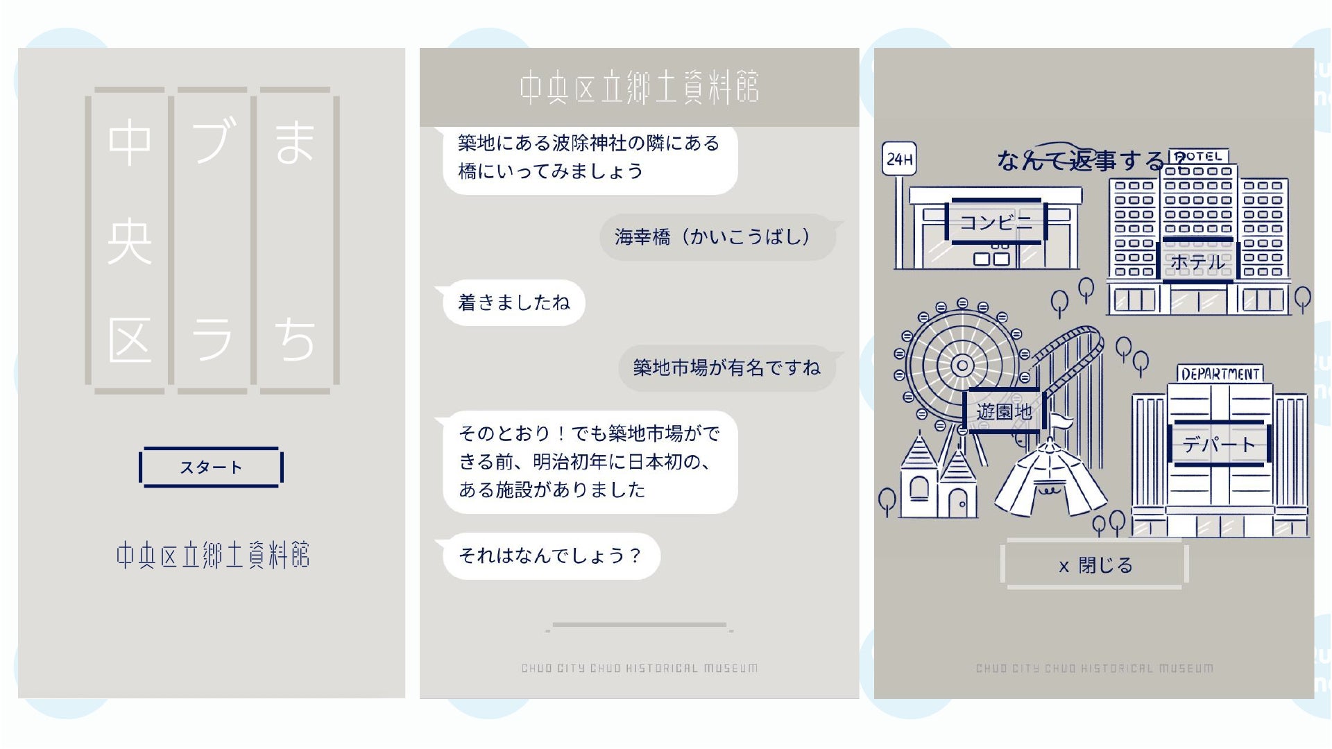 「まちブラ中央区」は、スマホやタブレットを使って資料館の床に広がる1950(昭和25)の地図をめぐり、クイズを解きながら、中央区内の歴史を楽しく学ぶことができるWebコンテンツです。