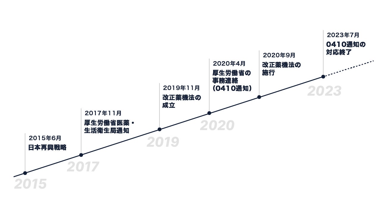 従来は、医薬品を処方する際には、薬剤師が対面による服薬指導を行うことが原則とされてきました。しかし、2015年に医療機関や薬局といった医療資源が乏しい離島、へき地の遠隔診療のニーズへ対応するために、国家戦略特区など一部の地域限定で実証実験が開始されると、2019年に成立した改正薬機法では、全国でオンライン服薬指導の実施が可能となりました。さらに、2021年6月に閣議決定された「規制改革実施計画」では、診療から服薬指導までをオンラインで一気通貫で行える状態を目指すことが方針として示されました。