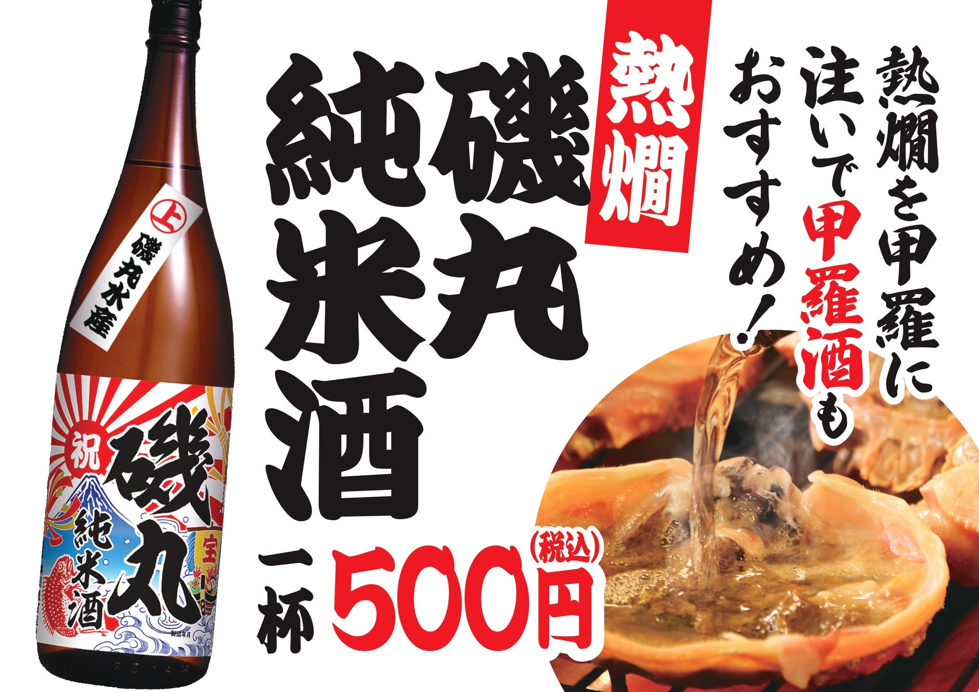 販売商品:【蟹味噌甲羅焼 蟹身ましまし】1,000円/個 磯丸 純米酒(熱燗)500円/杯 ※税込価格
